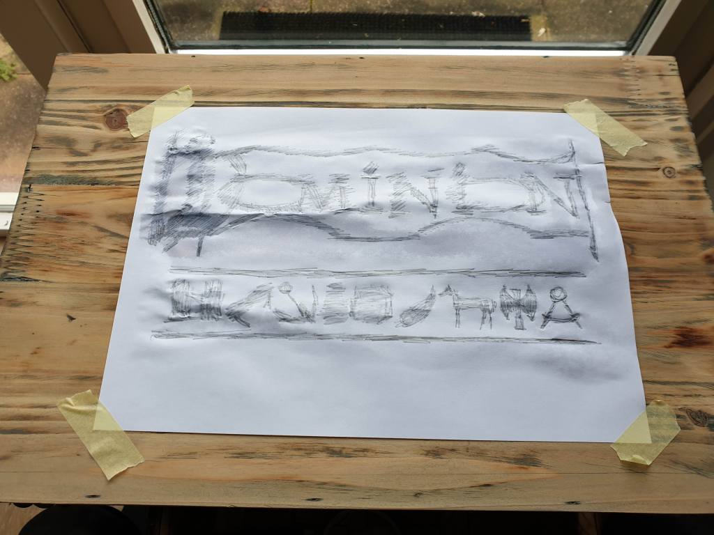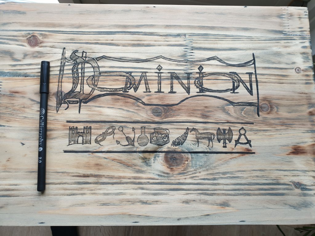 Het logo van Dominion heb ik spiegelbeeld uitgeprint op gewoon A4 papier, vervolgens op de kist geplakt met het bedrukte gedeelte op het hout. Je maakt het papier een kleine beetje nat en vervolgens ga je met een zacht potlood het logo bekrassen.
