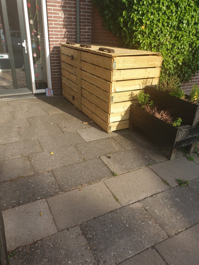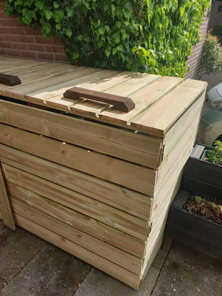 Verder kan je het voor jezelf zo ingewikkeld maken als je zelf wilt. De basis die je hebt gemaakt bekleed je met hout, net op een manier, zoals je zelf mooi vindt. De containerdeksels zijn door middel van een ijzerketting bevestigd aan de houten deksel. De handvatten die erboven op zitten heb ik zelf gemaakt, van oude balken van de schuur.