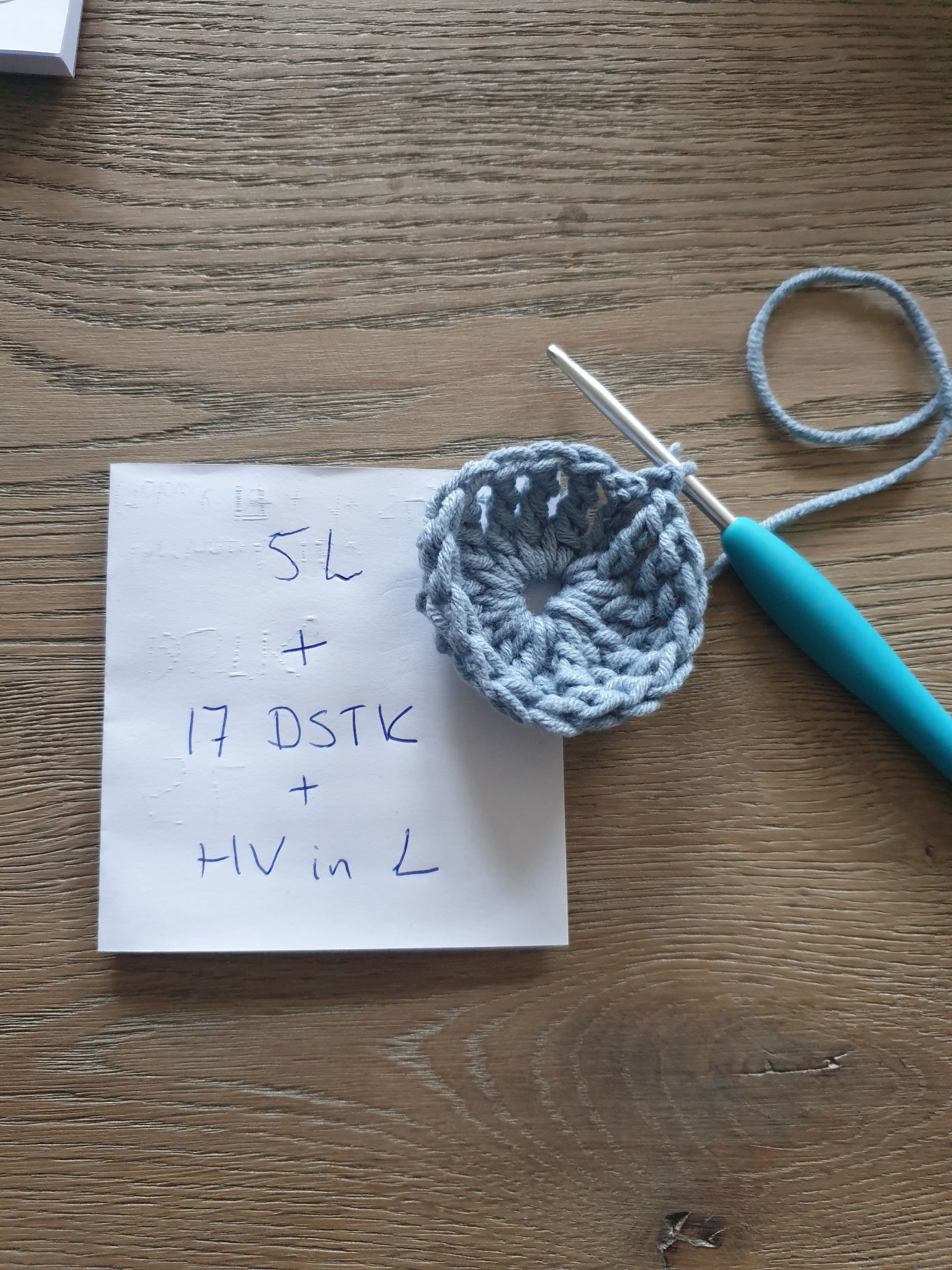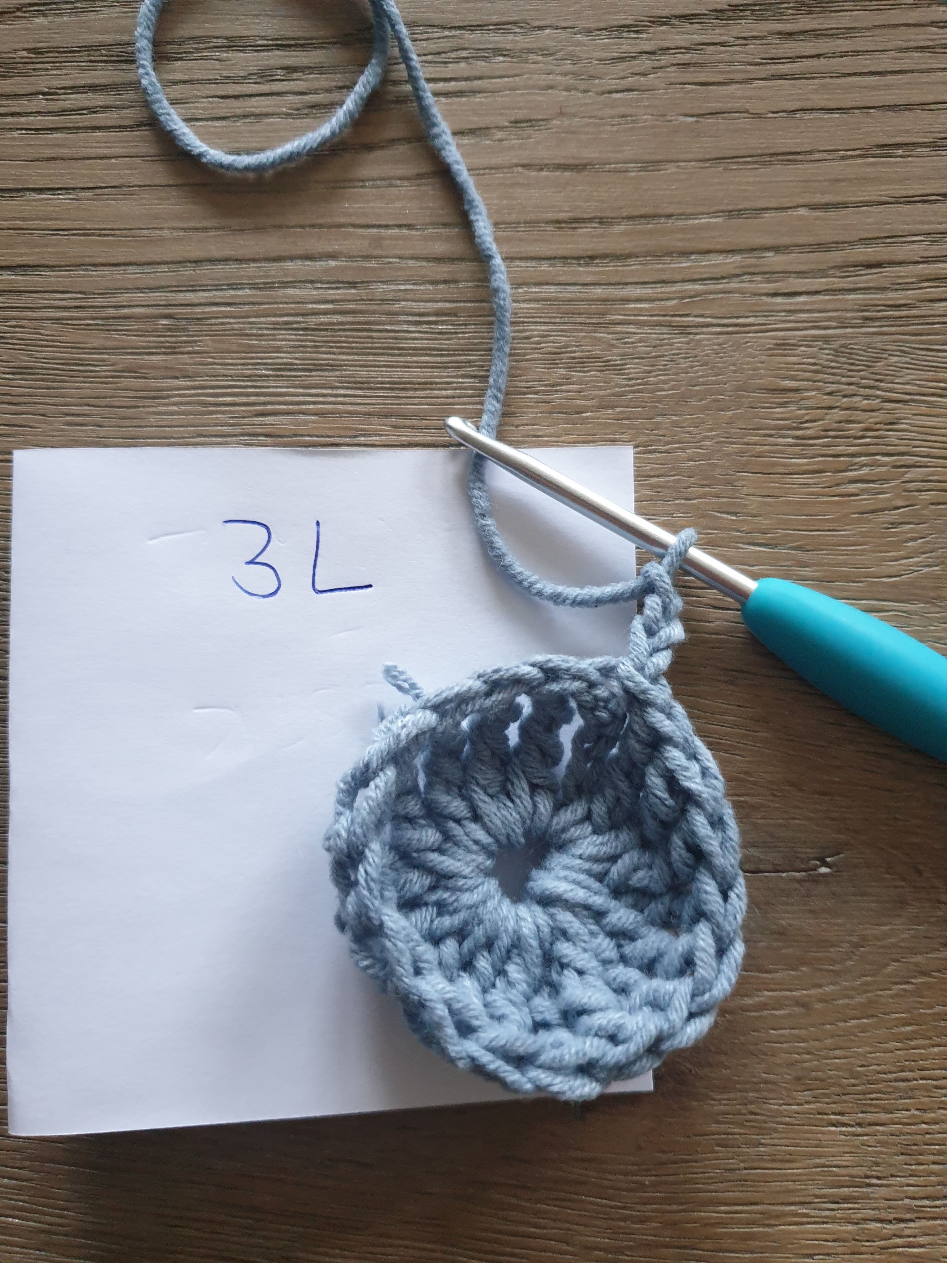 - Dit herhaal je een 16 keer zodat je op het eind 17 dubbele stokjes hebt en je de vijf lossen. Het laatste dubbele stokje maak je weer vast met een halve vaste aan je vijf lossen, zodat je een mooie rondje hebt. Het kan zijn dat je haakwerk een beetje rond trekt, maar dat is niet erg.
