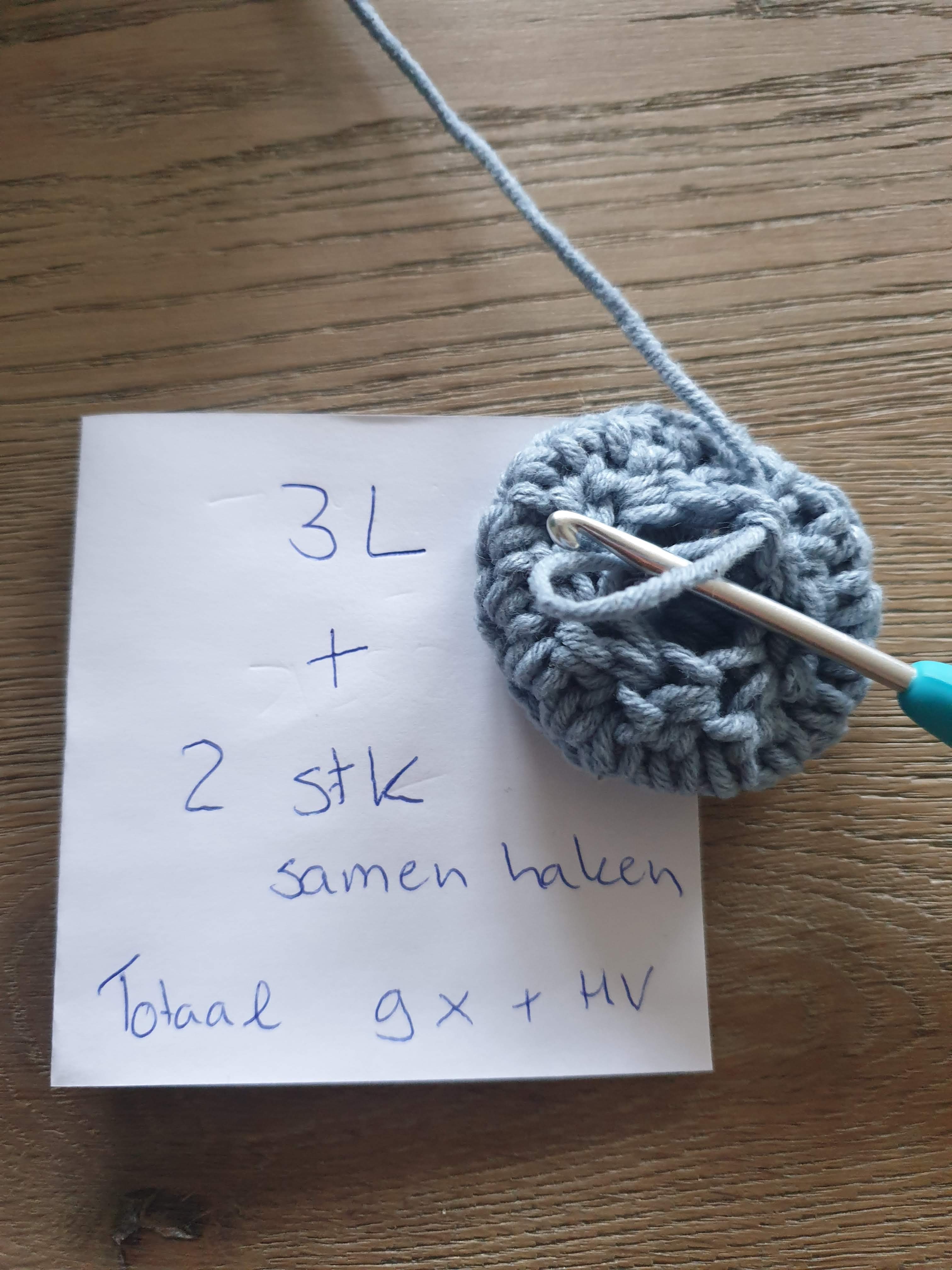 - Ook in het tweede dubbele stokje haak je weer een stokje, maar deze haak je samen met je volgende stokje (als je niet weet hoe je dit doet zie hier).