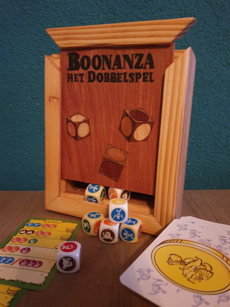 Het dobbelspel Boonanza werd uitgekozen als ideaal spel voor een nieuw kist met fineer deksel. Het kistje zelf is gemaakt van nog wat restanten vuren hout, deze zijn in verstek gezaagd en er is een sleuf gefreesd waar de deksel in kan glijden. Het dekseltje is dus gefineerd. De dobbelstenen heb ik eerst getekend in Sketchup zodat ik een 3D dobbelsteen had. Er is gebruik gemaakt van allerlei soorten fineer om een leuk kleureffect te maken.