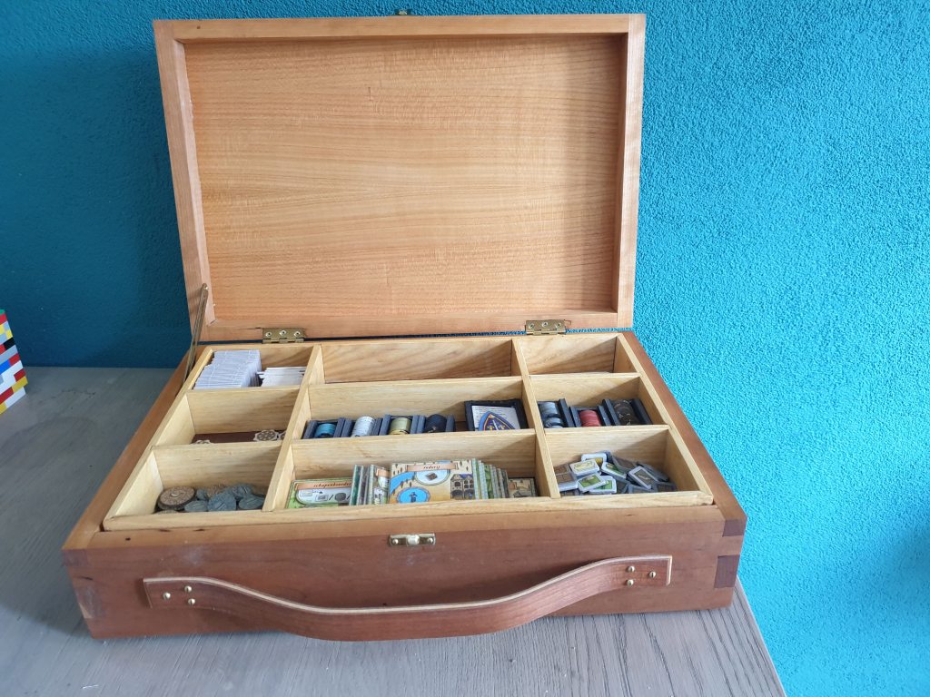 Maar de koffer was dus af en ik was er best wel trots op, wat is leuker als een mooi handgemaakt project ook een functie krijgt. Dus we openden weer onze spelletjeskast en zochten naar een leuk spel die het verdiende om in deze koffer te mogen verblijven. Het werd het spel Orléans, dit is een strategiespel waarin je een rijk gaat opbouwen. Je speelt met ridders, vaklieden en volgelingen. Dit vonden wij wel een geschikt spel om in de houten koffer te stoppen. Daarnaast leek het ook wel bijna alsof het er voor gemaakt was, alle onderdelen pasten er mooi in.
