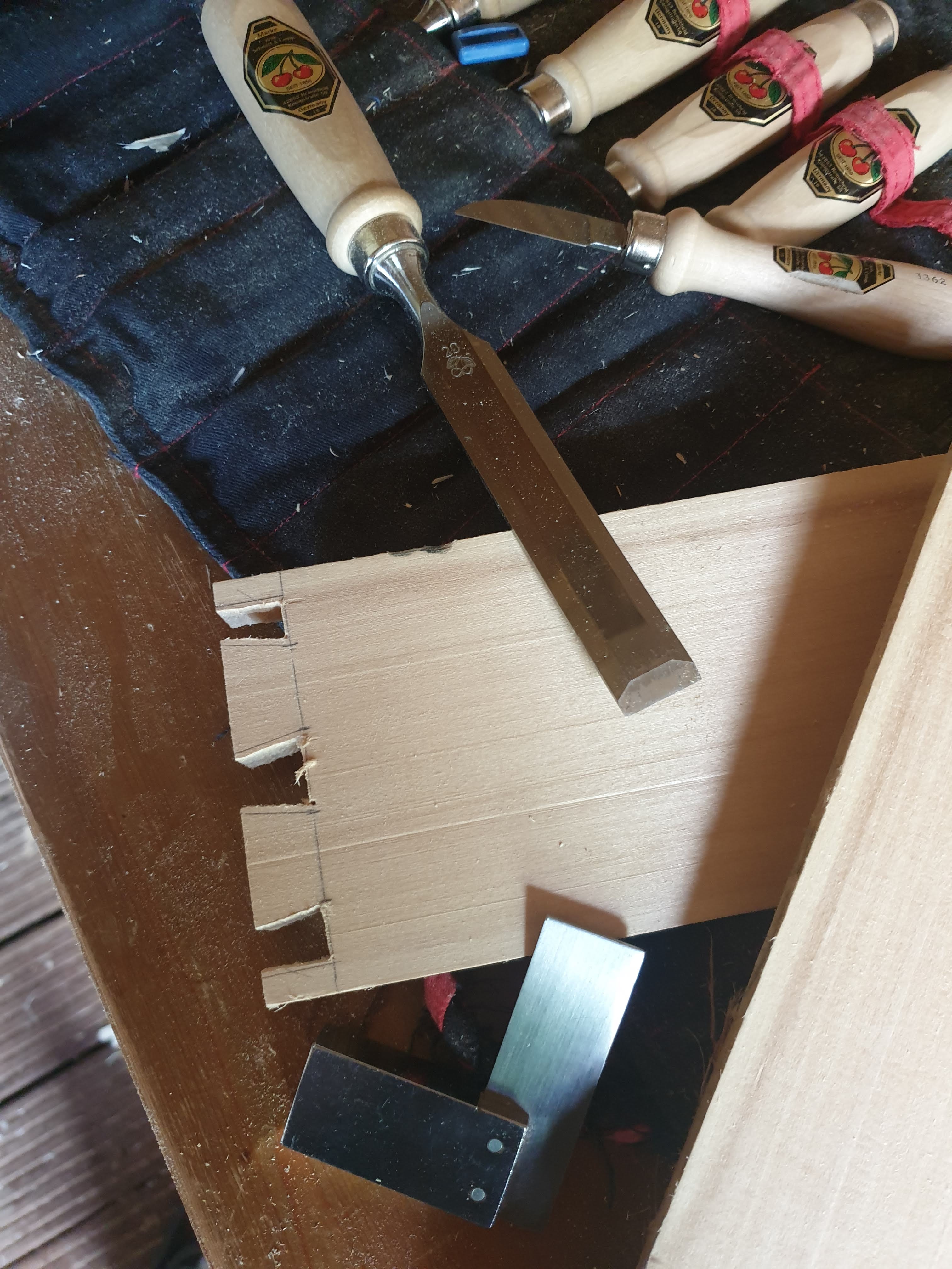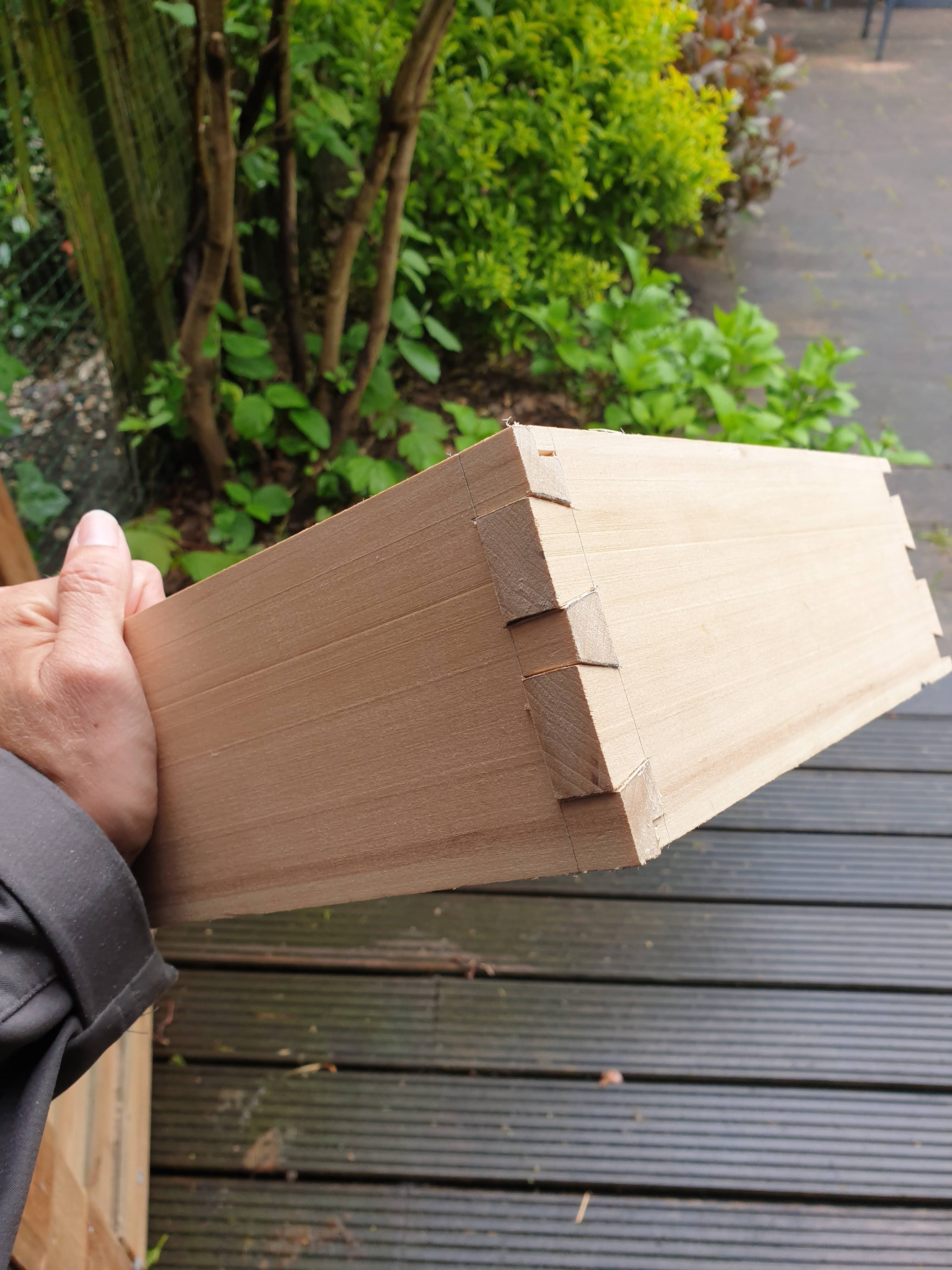 Voor het maken van de koffer hebben we lindenhout gebruikt, dit hout wordt vooral gebruikt voor houtsnijwerk (zie Carcasonne). Het hout is vrij zacht en snijdt dus heel makkelijk, en we vonden het wel eens leuk om een ander houtsoort te gebruiken. Ook bij deze koffer heb ik uiteraard de zwaluwstaarten gemaakt als hoekverbinding. Voordat de koffer in elkaar is gezet hebben we ook nog aan de onder en bovenzijde van de planken een sponning gefreesd, zodat daar de plaatjes hout van de deksel en bodem invallen.