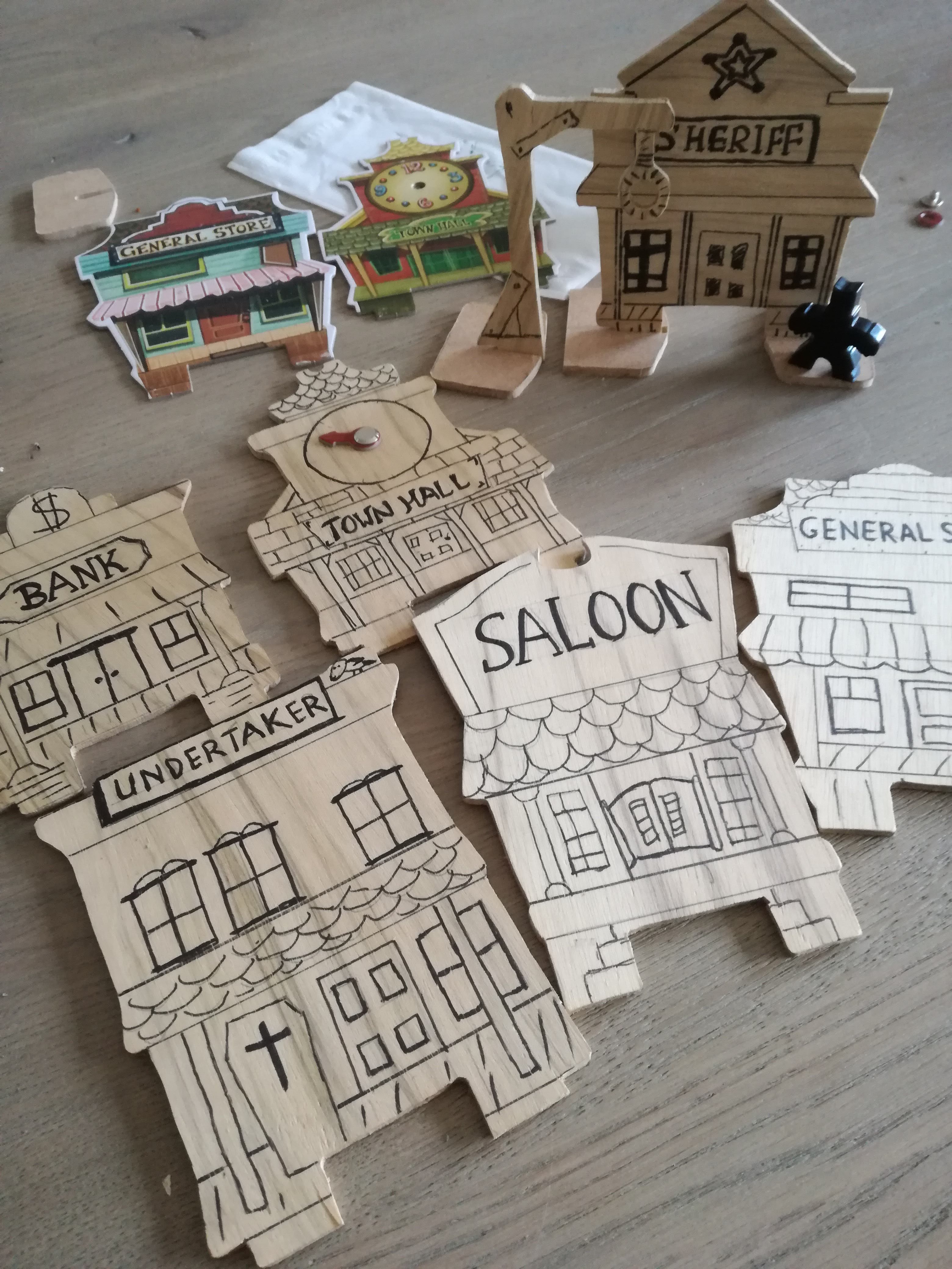We waren aantal opbergkisten verder en we dachten dat we ook wel een aantal spelonderdelen zelf konden gaan maken. Voor dit leuke behendigheidsspel moet je proberen met een schijfje je tegenstanders omver te schieten. Dit speelt zich af in een western wereld met een bank, een saloon, de sheriff en nog meer van die typische western gebouwen. Deze gebouwen waren van karton en waren een onderdeel van het spel, om je bijvoorbeeld in te ‘verstoppen’ of je moet er wat vandaan halen. Maar bij ons zijn deze kartonnen gebouwen ingewisseld voor een houten edities. De kartonnen gebouwen hebben wij op een plaat hout gelegd, overgetrokken en vervolgens met de figuurzaag uitgezaagd. De tekeningen zijn ditmaal uit de hand getekend, maar wel weer met een watervaste stift. Op deze manier hebben wij de gebouwen net wat meer allure gegeven doordat ze nu van hout zijn gemaakt.