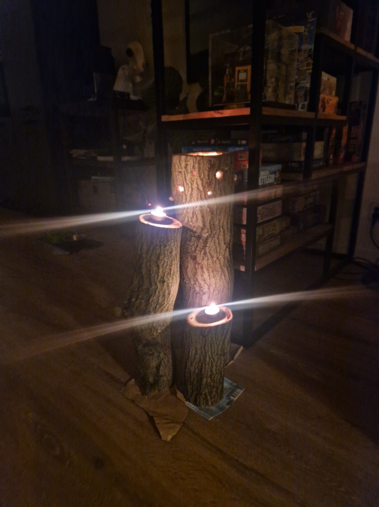 De boomstammen als kaarsenhouders was iets meer werk. Deze stammen komen uit hun eigen tuin, maar waren nog vrij nat dus wat lastiger om goed te bewerken. Uiteindelijk hebben het voor elkaar gekregen met verschillende vlinderboortjes een gat in de stam te maken waar een grote kaars in past. Rondom zijn er nog gaten in geboord zodat het kaarslicht er uit verschillende kanten uit kon stralen.