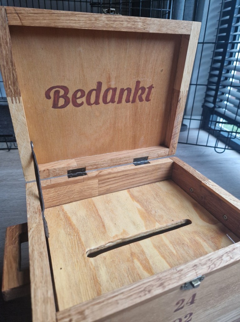 Op de voorzijde is de trouwdatum geschilderd en aan de binnenzijde ‘bedankt’. Nog een plankje op maat gezaagd, zodat die in de kist past, met een sleuf zodat de enveloppen erin gestopt kunnen worden maar er niet uit gehaald.