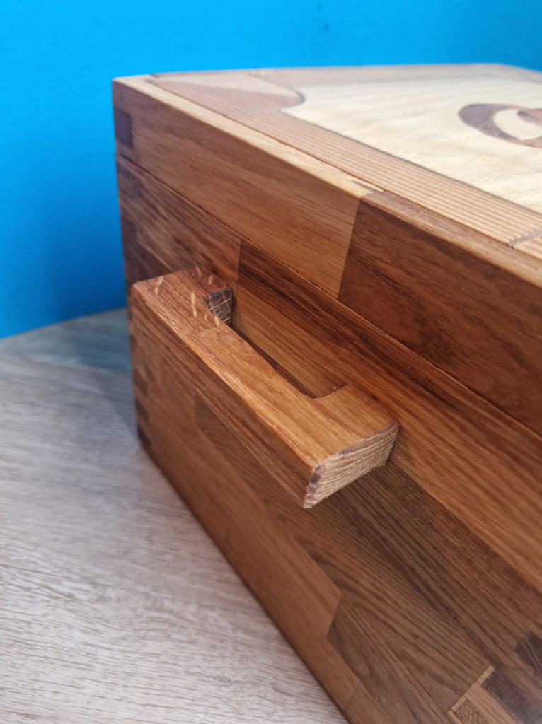Dus op naar de ontwerp tafel! Ik had al een paar keer video’s voorbij zien komen waarbij ze met de frees of zaagtafel heel gemakkelijk een strakke tandverbinding konden maken. Ik wilde dit graag ook een keertje gaan maken, dit was het ideale project om dat te gaan proberen. Ik had nog een mooi stukje eikenhout liggen, die precies voldeed aan de afmetingen voor de kist. Nu moest ik alleen een mal gaan maken die mij ging helpen bij het frezen van de tandverbindingen.