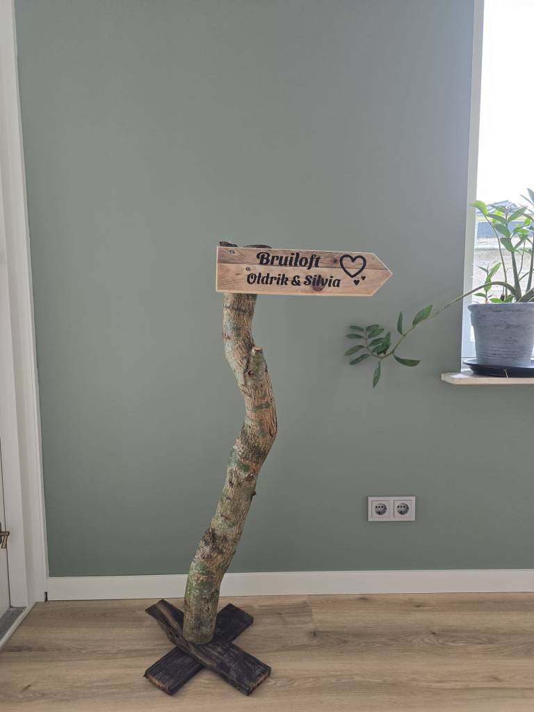 Naast deze enveloppenkist was er mijn ook nog gevraagd om kaarsenhouders te maken en een welkomstbord met hun namen erop. Het welkomstbord is gemaakt van een stuk pallethout, gezaagd met een mooie punt eraan, geschuurd en gefreesd. Met behulp van carbonpapier de tekst erop geschreven en ingeschilderd.