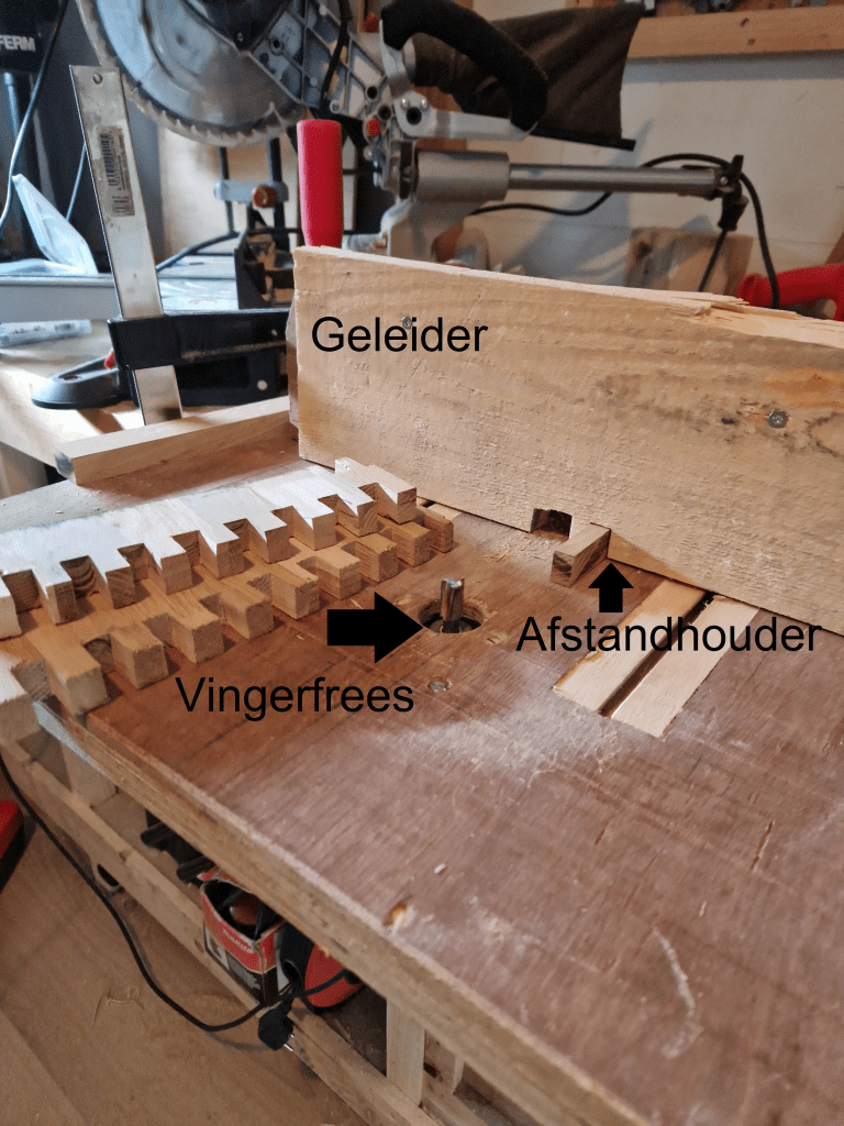 Ik had al eerder een freestafel gemaakt, deze kon ik nu ook weer gebruiken. Alleen had ik wel een nieuwe geleider nodig die nu ook van voor naar achteren bewogen kon worden zonder scheef te gaan. Daarnaast moest er een afstandhouder komen, waardoor je gemakkelijk elke keer dezelfde afstand hebt om weg te frezen. Na wat try and errors, is het uiteindelijk gelukt om een stabiele geleiding te maken dus kon er gefreesd worden in de echte planken.