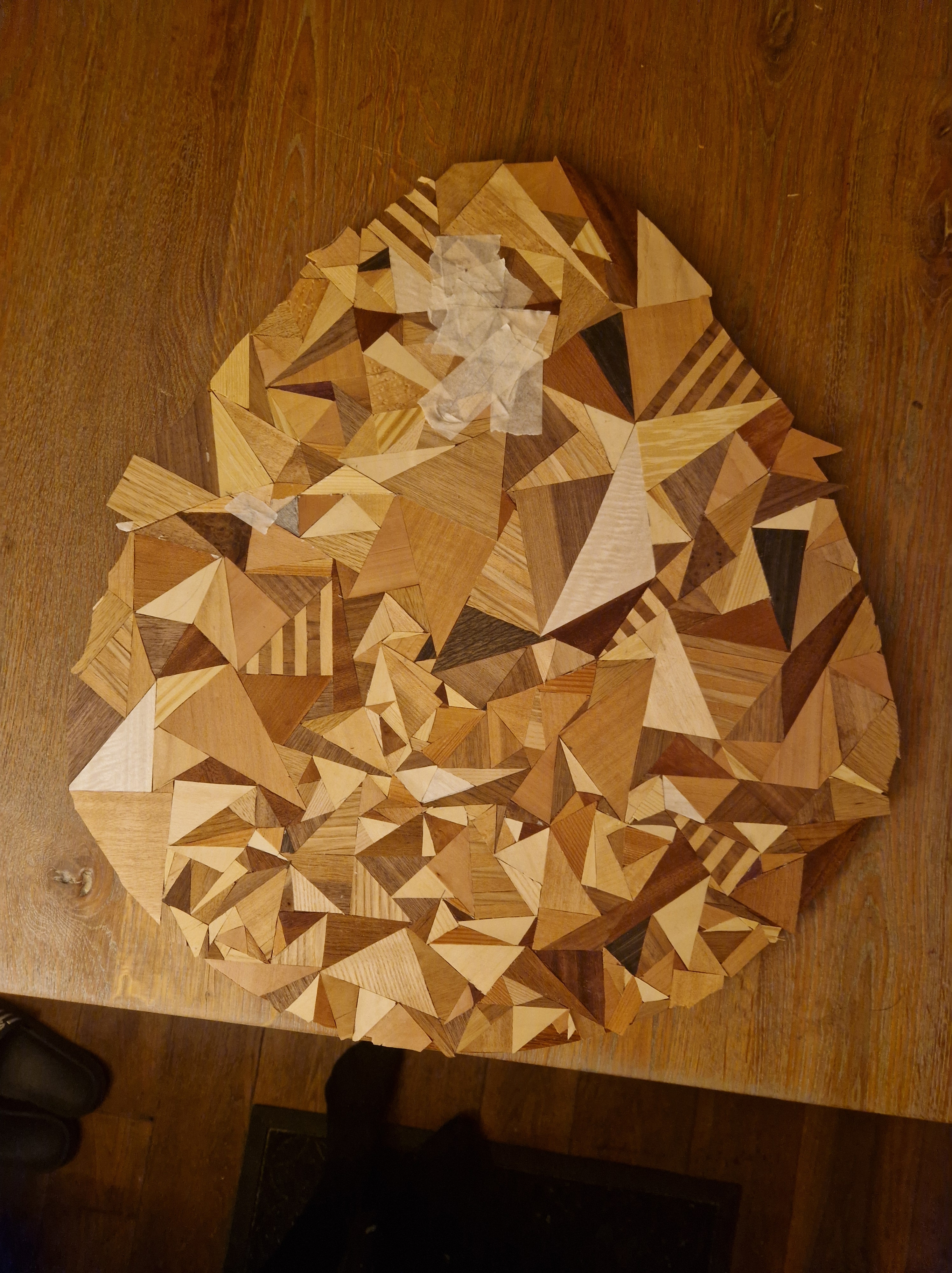 Patroon was gevonden! Het werden allemaal driehoeken, met een aantal driehoeken die uit twee kleuren opgebouwd zijn. De driehoeken heb ik allemaal een voor een gesneden en op de tafel geplakt, simpeler kan bijna niet.