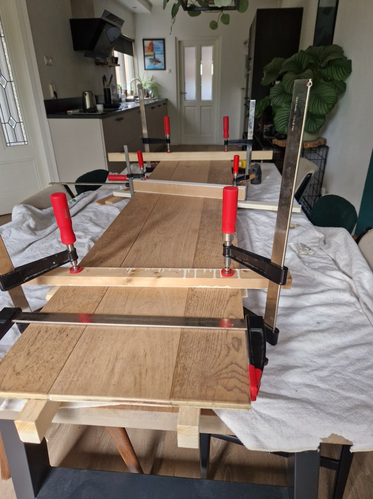 Er is dus gebruik gemaakt van de oude vloerdelen, voor de breedte van het zitgedeelte hebben we drie planken weer in elkaar gezet en verlijmd. Voor de lengte was de lengte van de vloerdelen gelukkig afdoende. Het complete balkensysteem hebben we volledig bedekt met de vloerdelen, deze zijn allemaal verlijmd, er is geen schroef aan te pas gekomen.