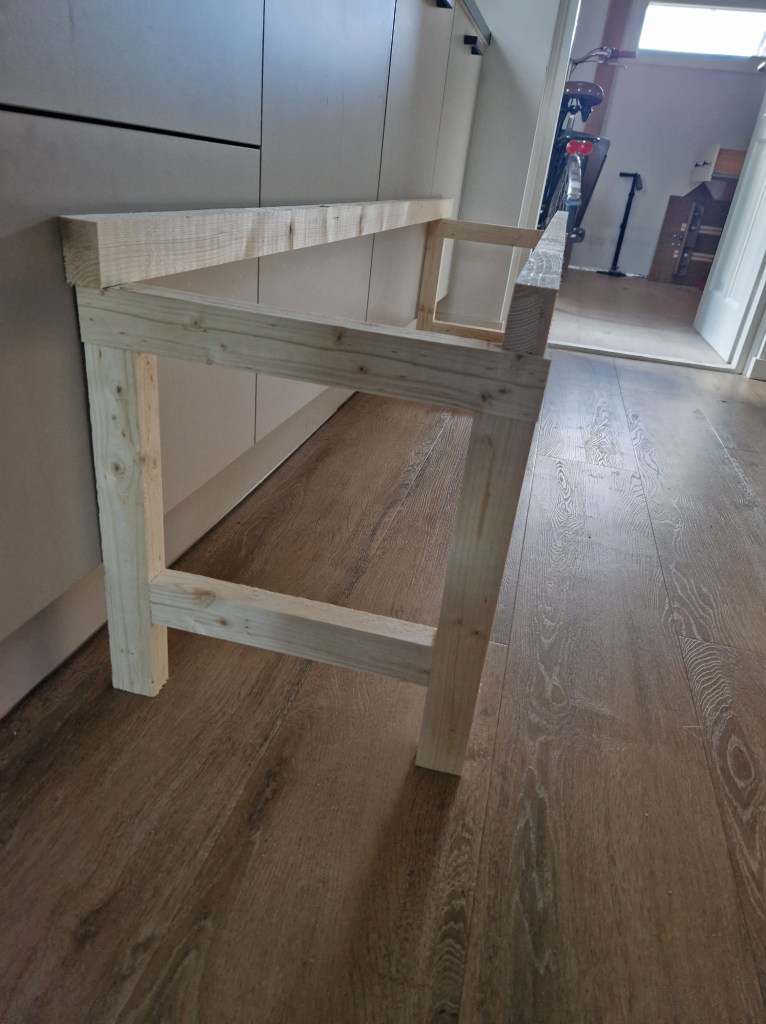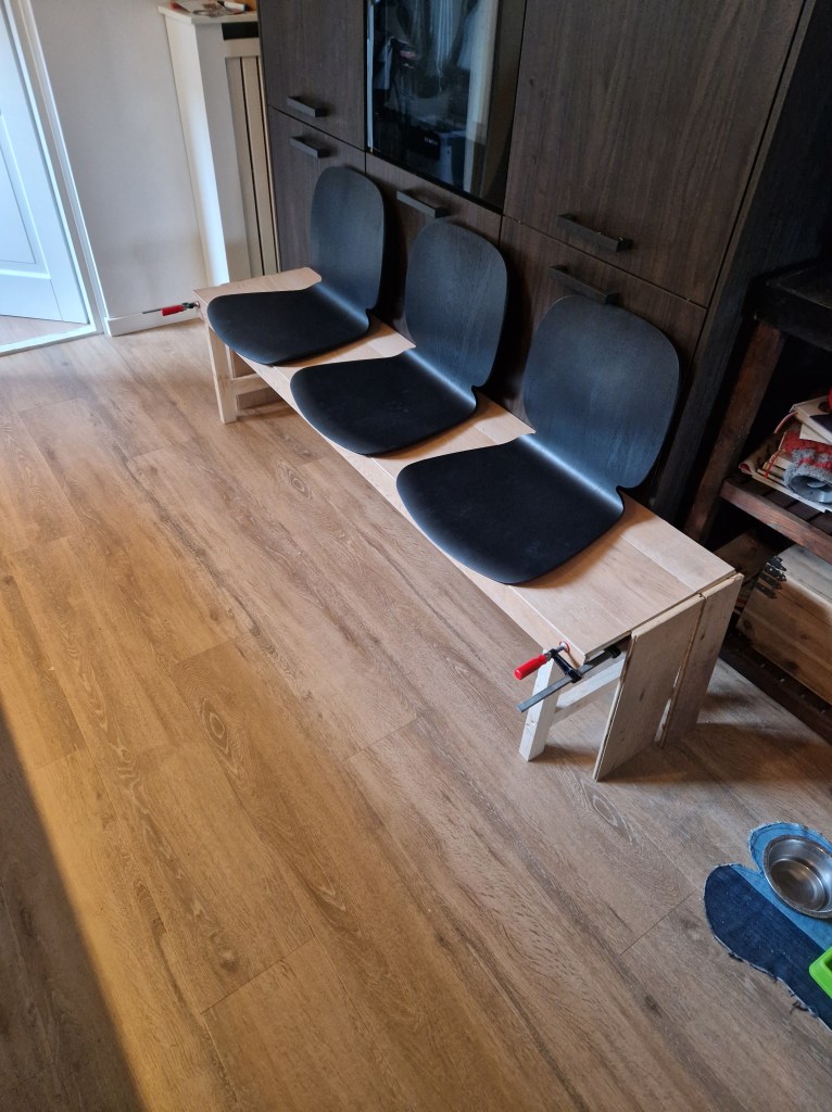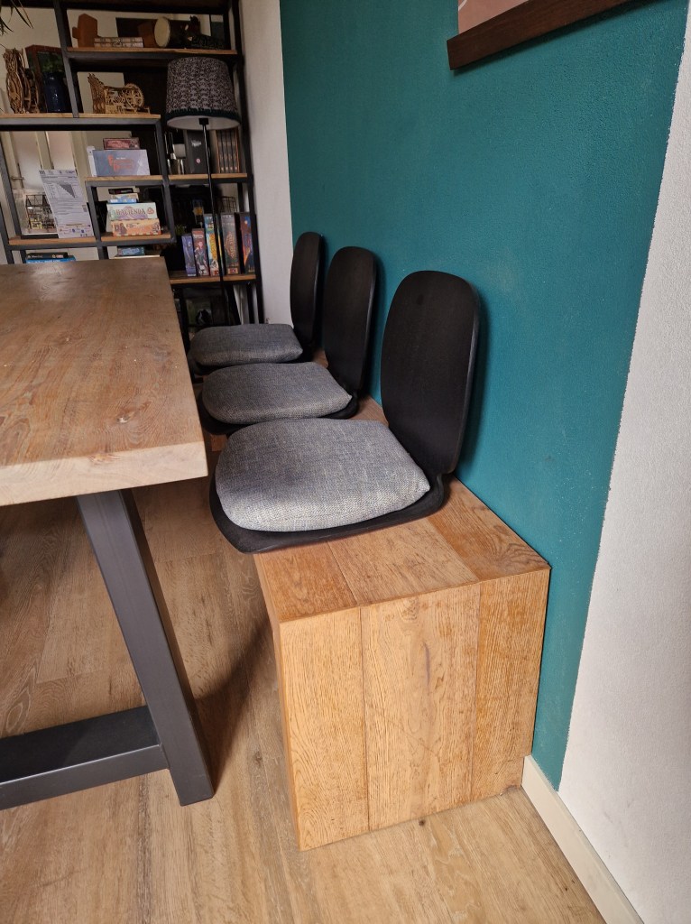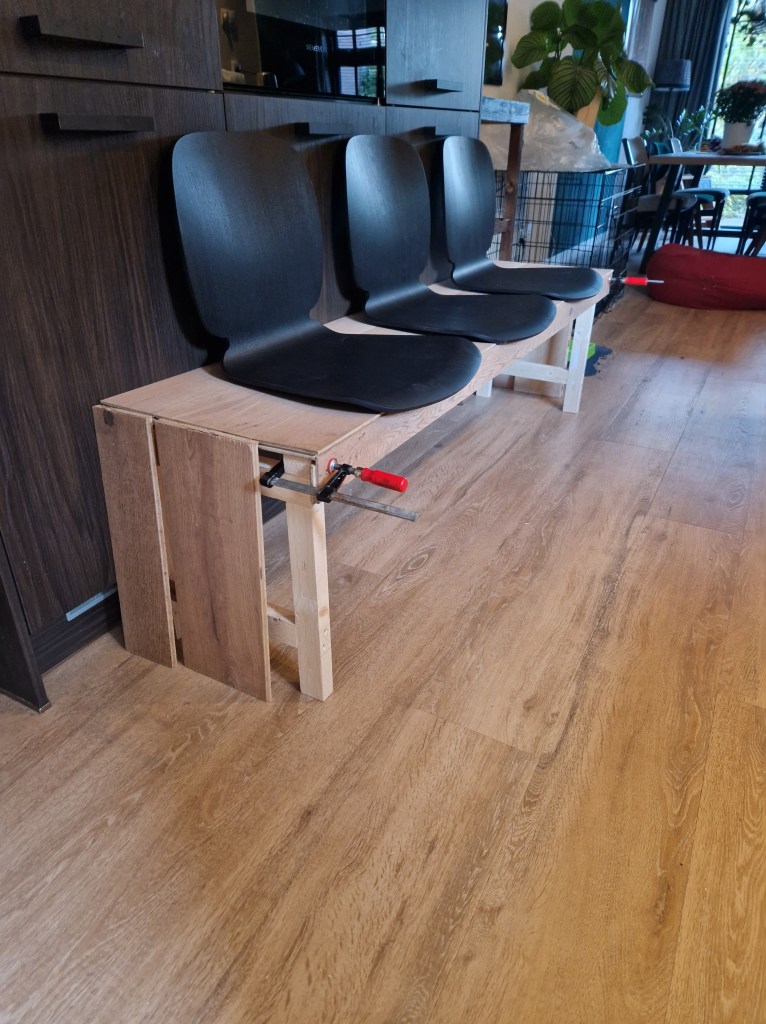 Een middagje struinen in de Ikea, wie kent dat niet. Na een volle winkelwagen toch nog even langs de koopjeshoek, je weet nooit wat voor leuks daar ligt. En ja hoor, daar lagen een aantal stoelzittingen voor een 1 euro per stuk, vriend grappend ‘ow, daar kunnen we wel een eetkamerbank van maken’. Na het rondje in de koopjeshoek afgemaakt te hebben toch nog een keertje kijken. Twijfelend of het wel wat zou kunnen worden toch maar drie zittingen meegenomen want, wie maakt je wat voor de 3 euro!